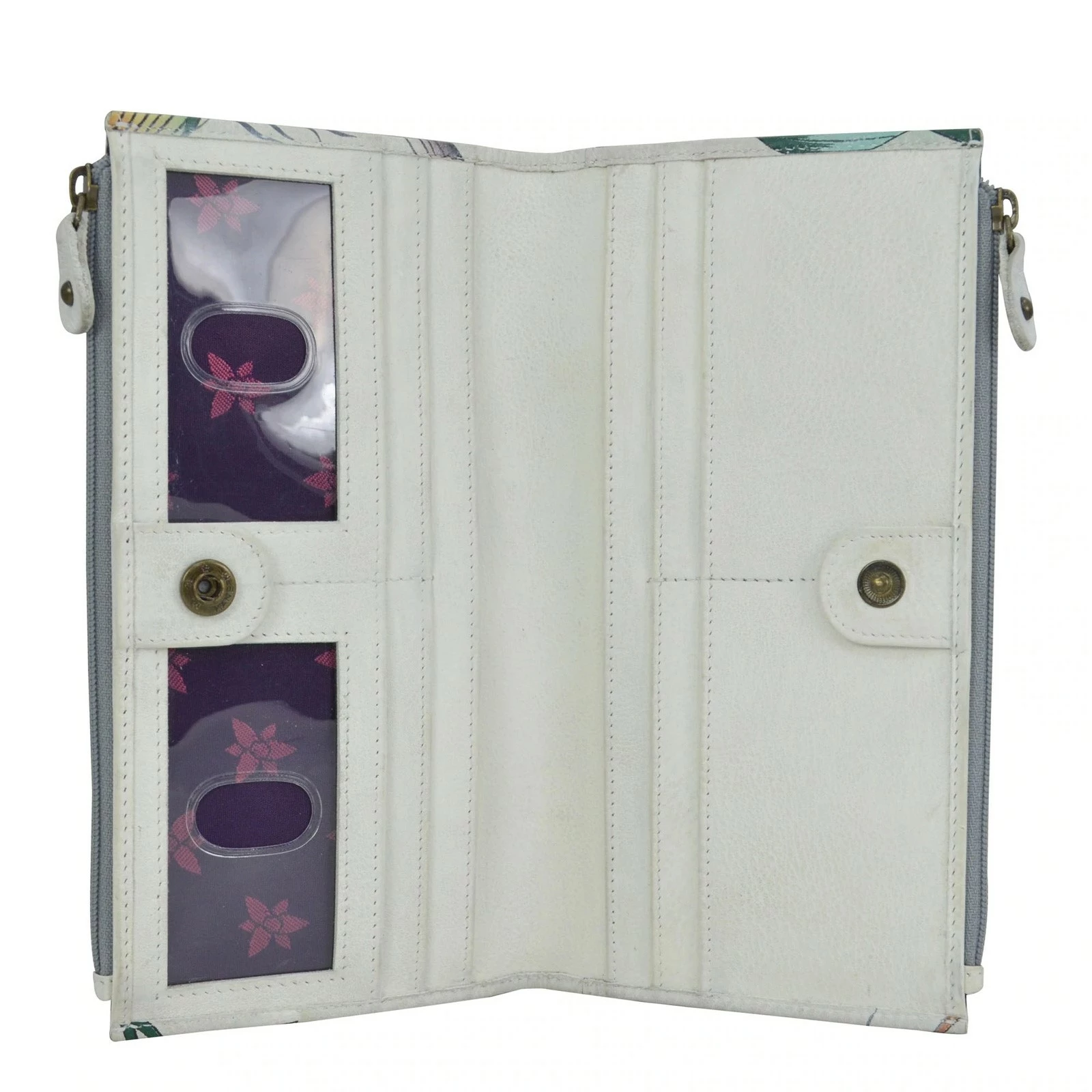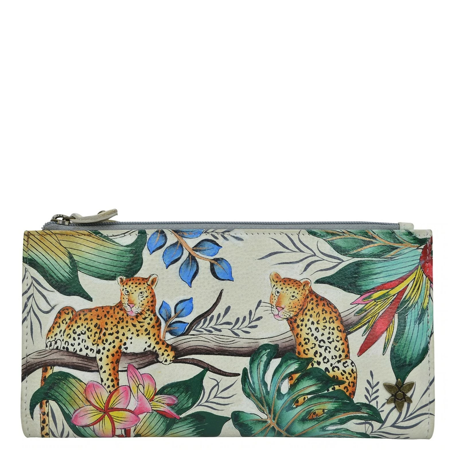 Anuschka, Two-Fold RFID Wallet. Carry all your cards, cash, and essentials in unique style with the hand painted Anuschka Two-Fold RFID Wallet. This bi-fold wallet features two external zippered pockets, two bill pockets, and six card slots for storing everything from credit cards to passports.