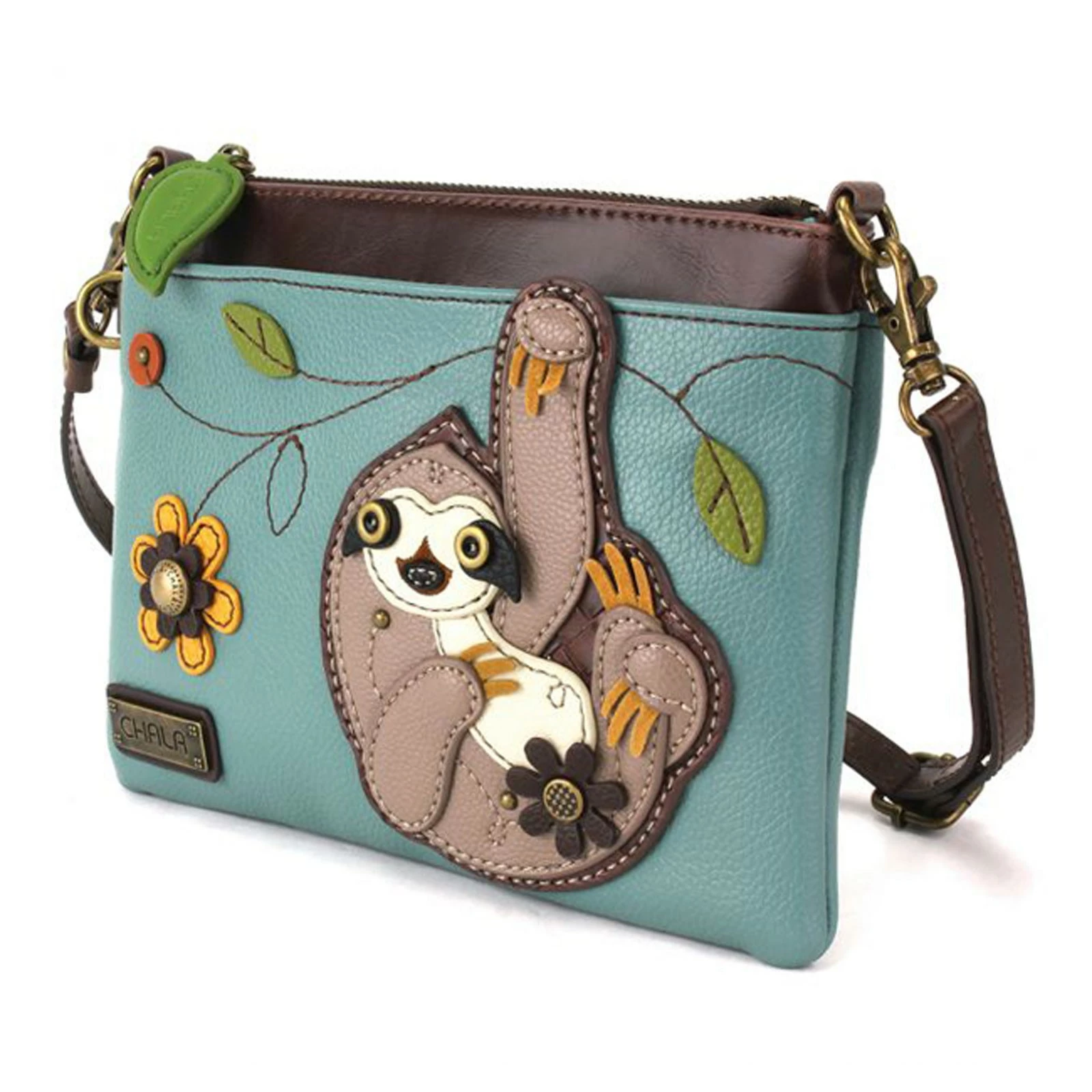 Chala, Sloth Mini Crossbody. This little cross body bag is the perfect size to tote around a few essentials whether you are out on the town or running errands. It has two adjustable straps that are detachable, which allows you to wear it in different styles.