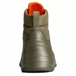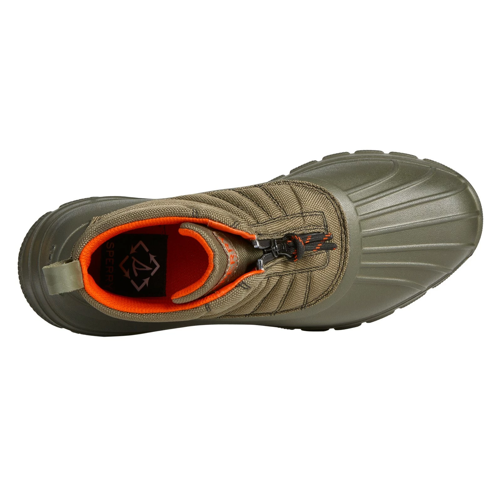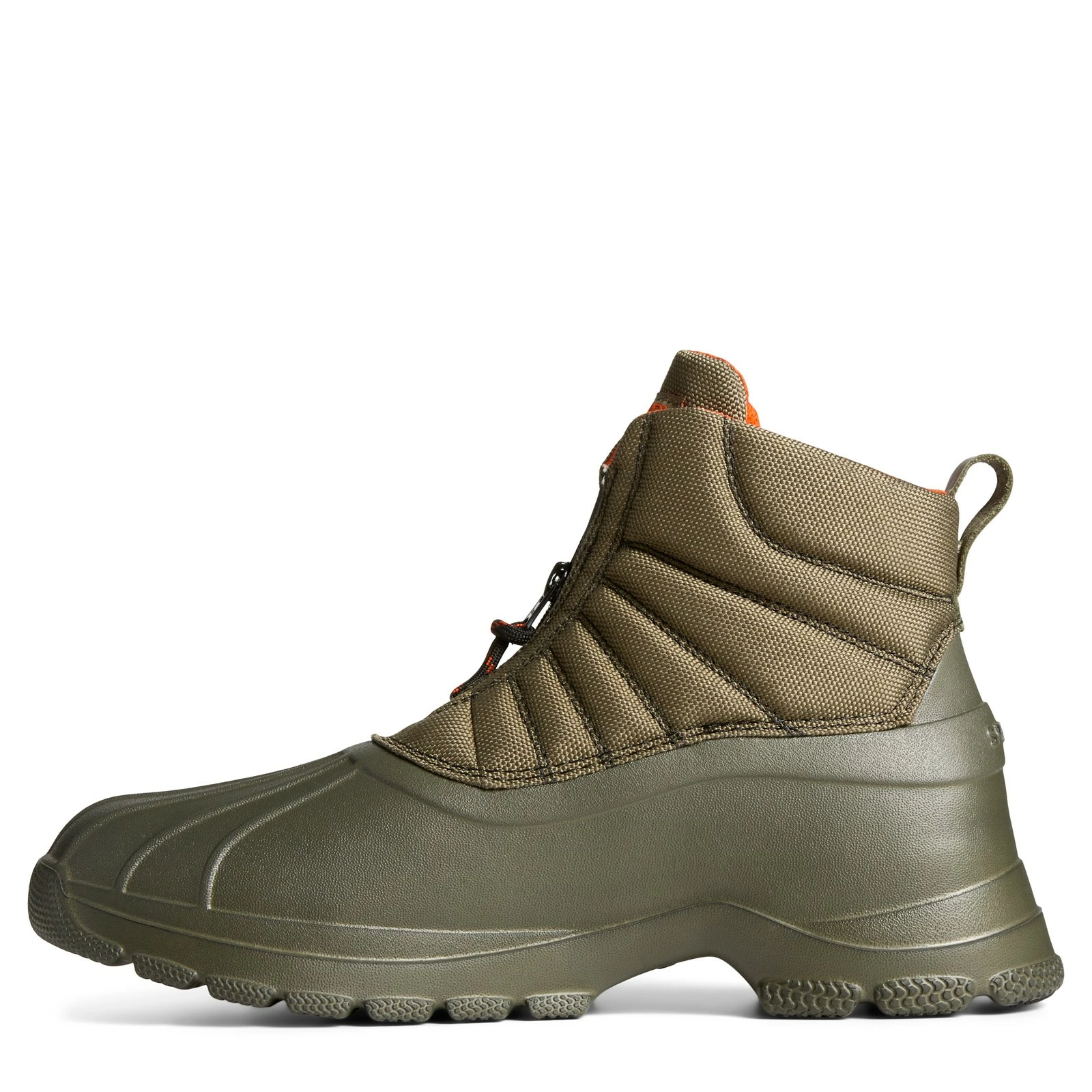 Men’s Sperry, Duck Float Zip Rain Boot. This duck boot features a SeaCycled tough weave upper and mesh lining, which works to repel water and keep the interior insulated and warm. A zip closure design provides easy on/off style while you stay dry, and with a rubber duck shell that repels water.