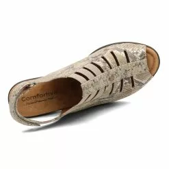 Women’s Comfortiva, Faye Sandal. Make any outfit stand out with these fashionable snake print peep toe sandals! Offering optimal foot coverage and a stretchy instep, this sandal is a top pick.