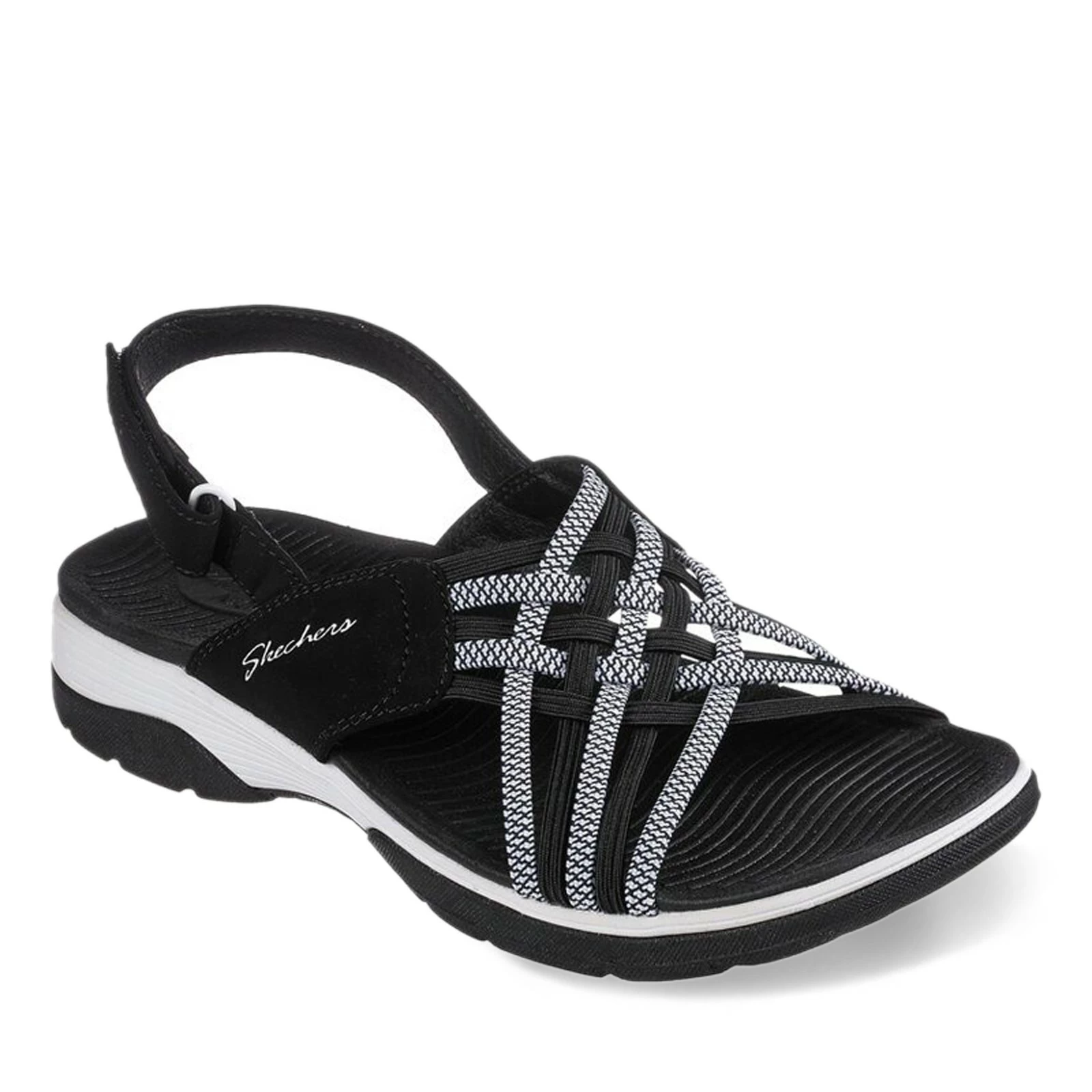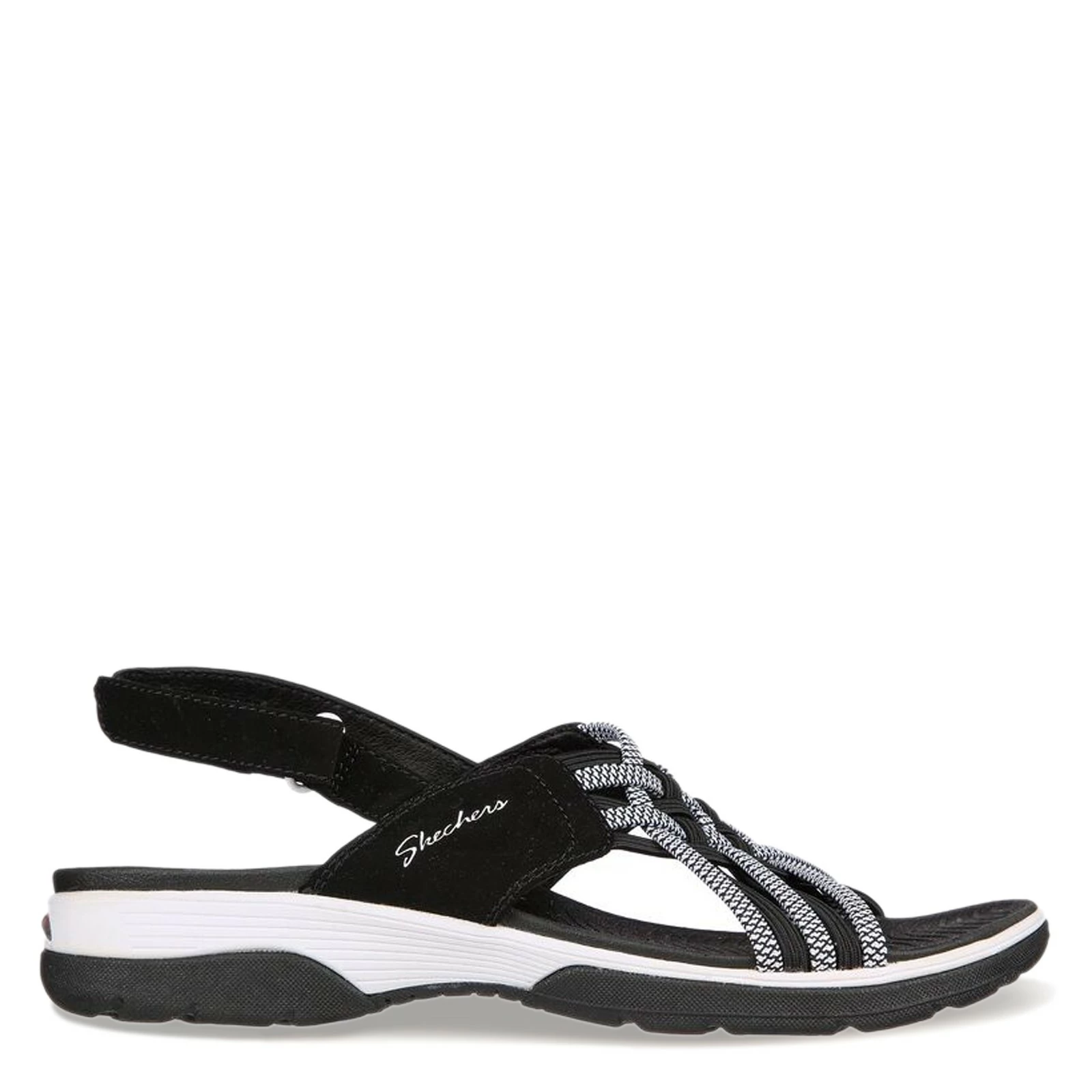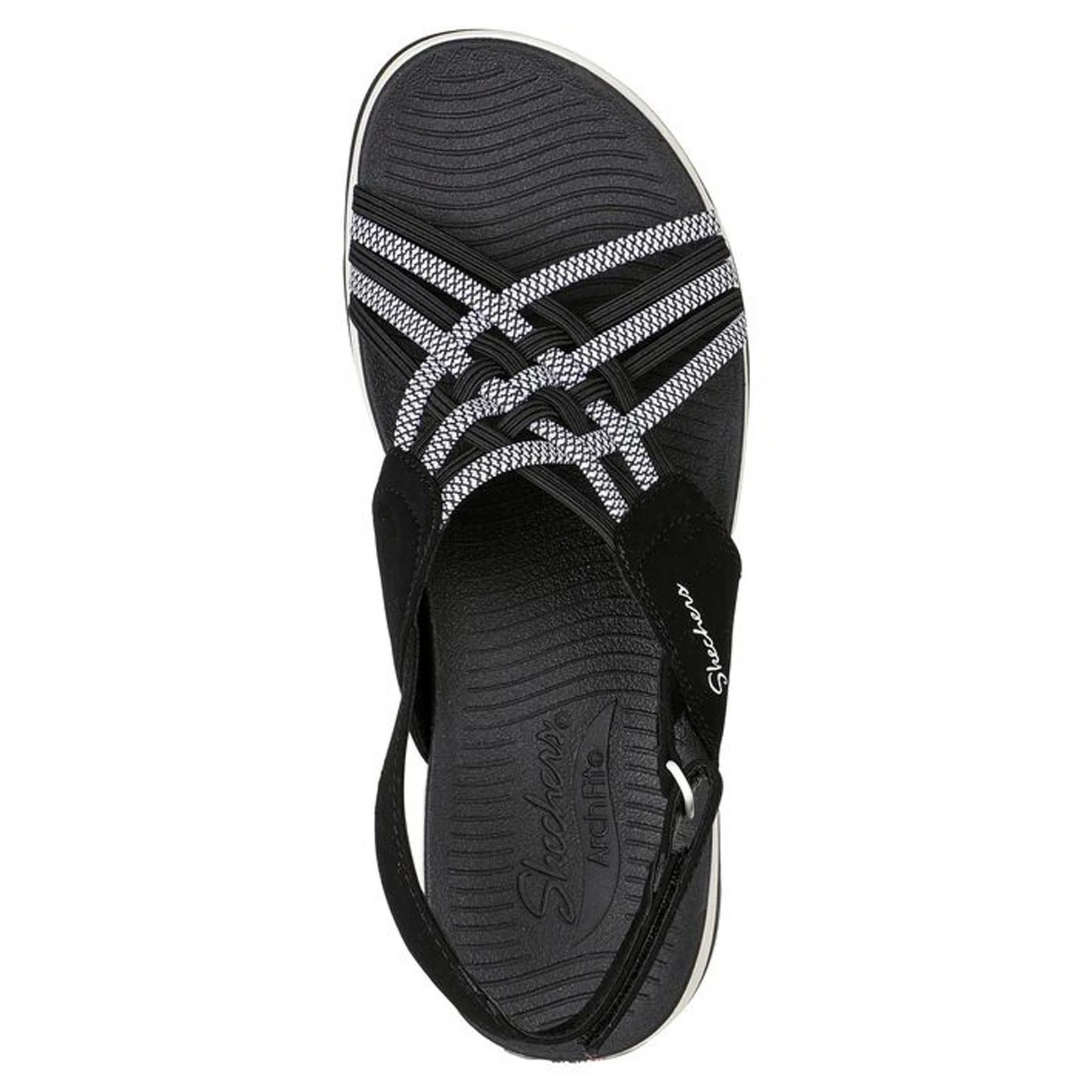 Women’s Skechers, Arch Fit Reggae Sport Sandal. These all-day comfort sandals feature a strappy stretch fabric upper with adjustable sling-back strap closure and a supportive Arch Fit contoured footbed. The podiatrist-designed shape was developed using data from over 120,000 unweighted foot scans.